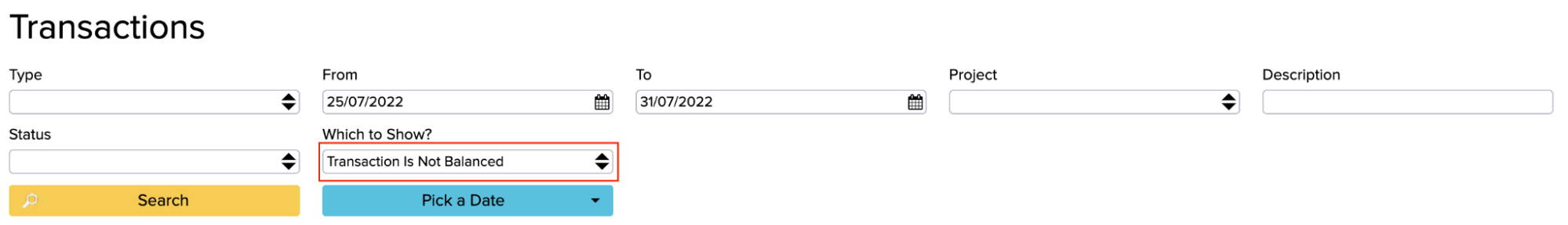 4. Open ‘’Accounting -> Transactions’’ and select ‘’Transaction is Not Balanced’’ in the ‘’Which to Show?’’ field and check the displayed journals.