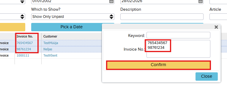 - Write or copy (e.g., from Excel) the required numbers into the Invoice No.: table