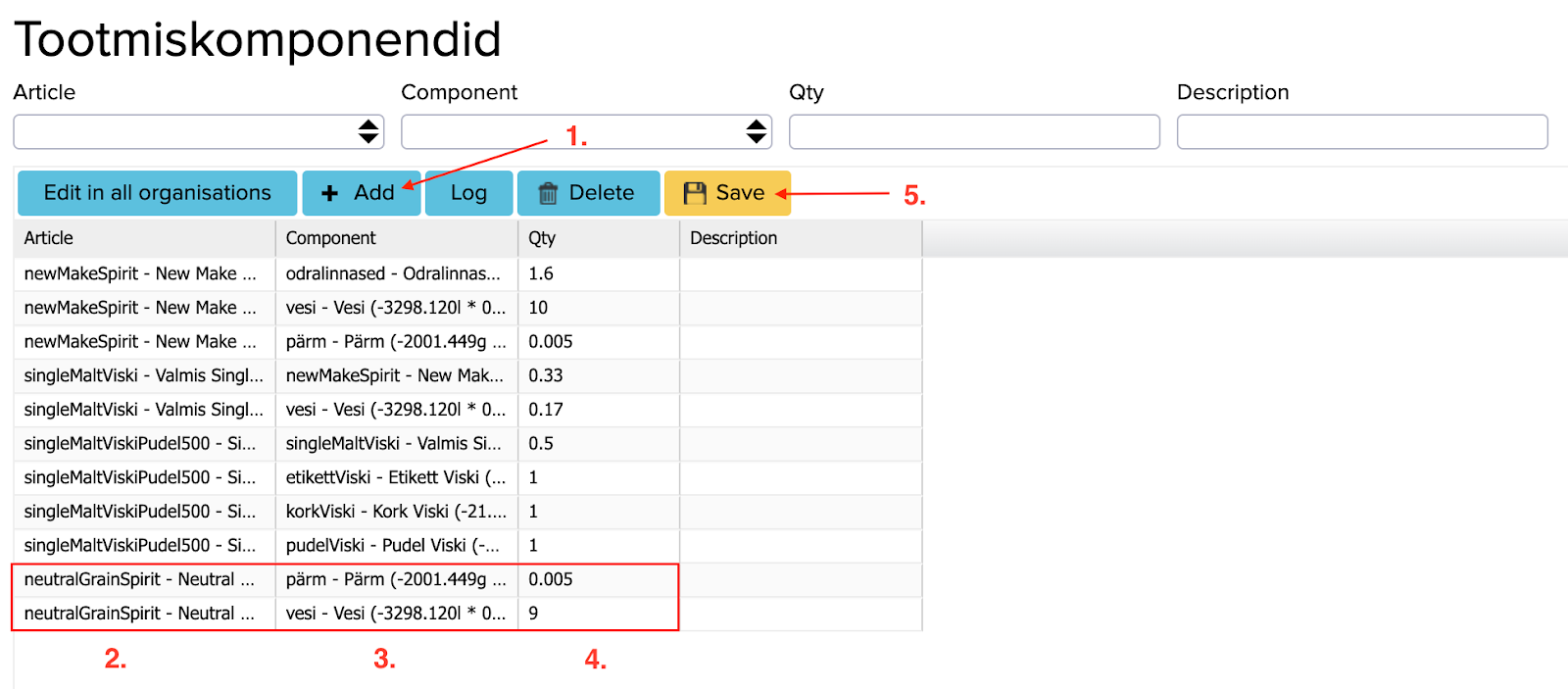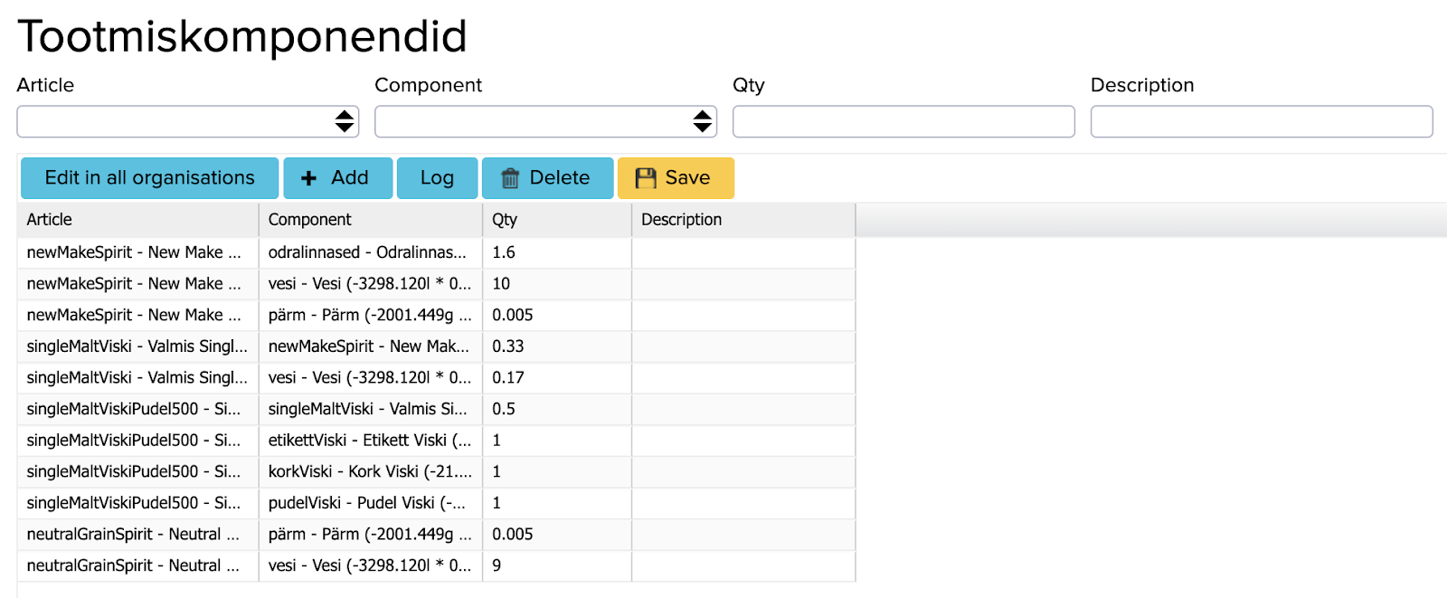 Each finished product needs to have its own recipe. In the case of distillation, the recipe lists which ingredients are used. The finished product (before packaging) features its components, and when the product is bottled, the recipe should also include the bottle, cap, label and other packaging materials.