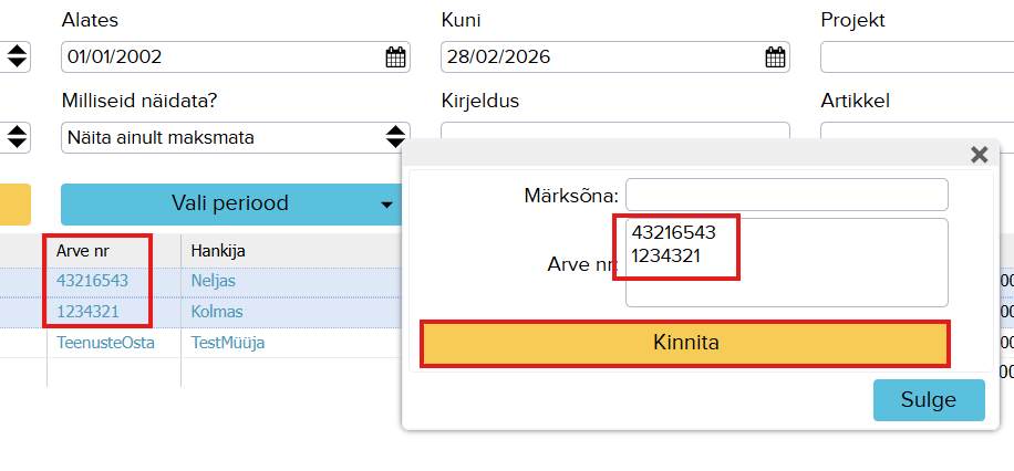 Probleem: ühe maksega seotud mitu hankijat ning sellisel juhul tuleb korraga valida mitme hankija arved. Näiteks kahe erineva hankija arvete otsimiseks: