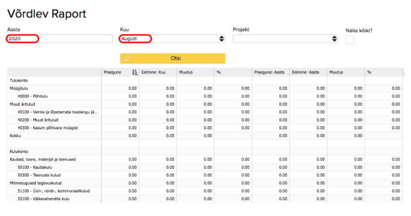 Ava “Aruanded” > “Kasumiaruanne” > “Võrdlev raport”. Võrdleva raporti abil on võimalik analüüsida ja omavahel võrrelda erinevaid aruandeperioode. Omavahel saab võrrelda näiteks kahte kuud ja aastat.