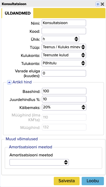 Avaneb artikli kaardi leht, kuhu tuleb sisestada informatsioon: nimi, ühik, tüüp, kulukonto, tulukonto. Võimalik on määrata ka baashind, mida alati müügiarvel selle artikli kasutamisel kuvatakse ja juurdehindluse %. Baashind ja juurdehindluse protsent ei ole kohustuslikud väljad. Seejärel vajuta “Salvesta” nuppu.