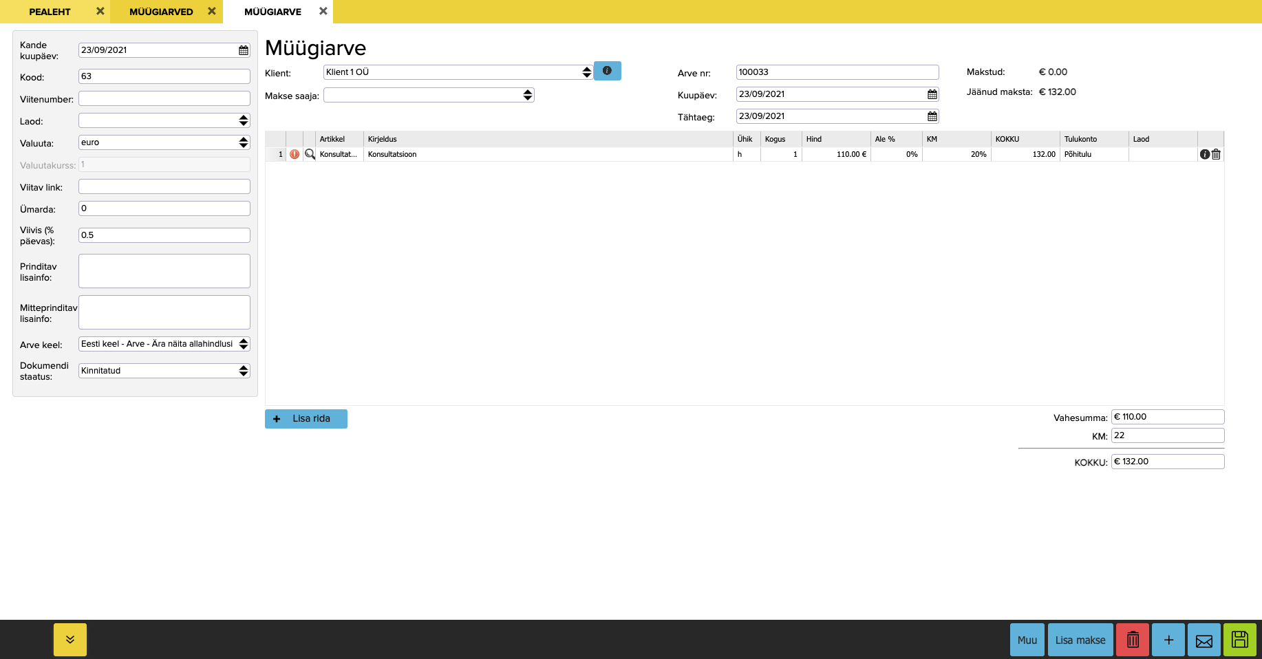 Avaneb müügiarve koostamise moodul, kus täida vajalikud väljad ja salvesta.