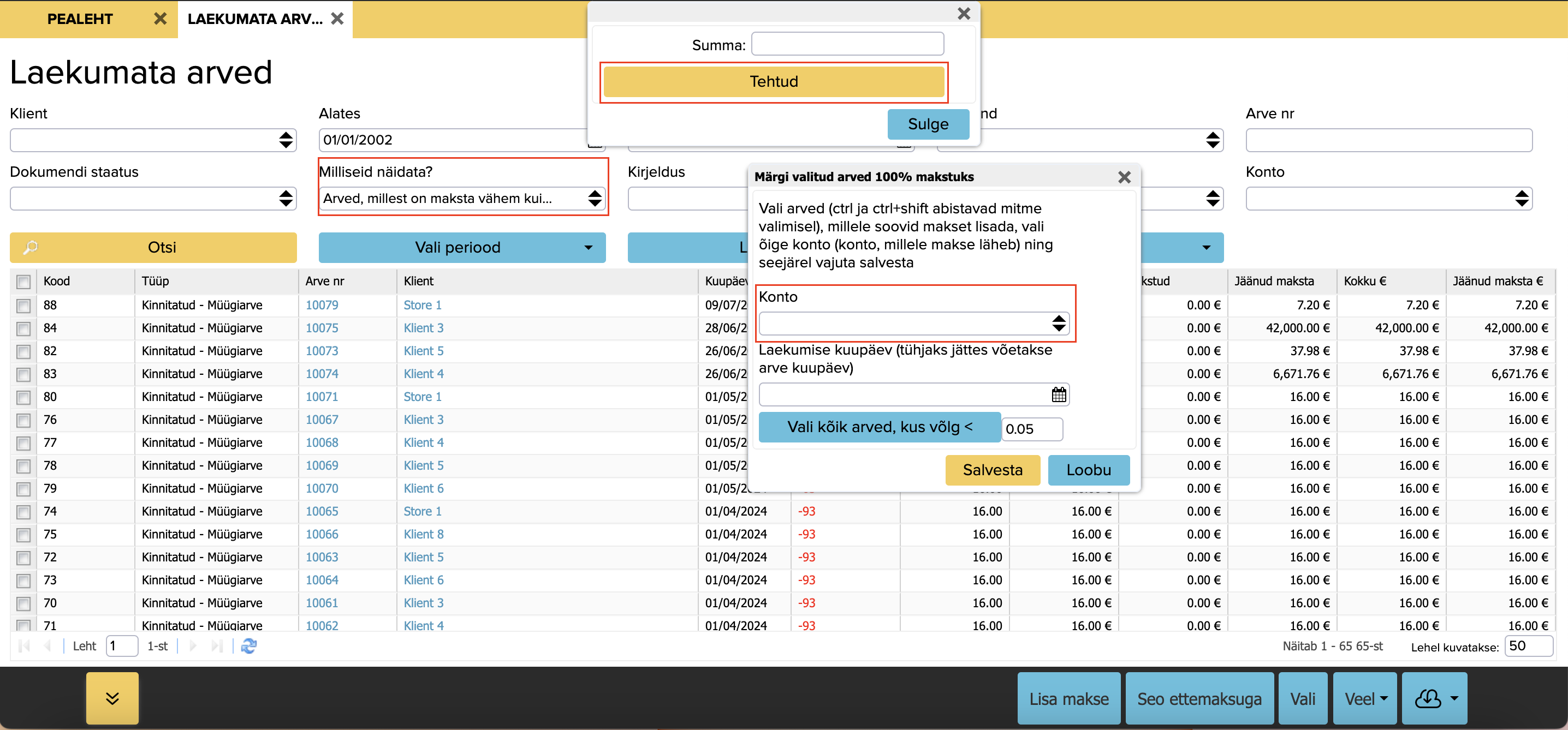 Valige müügiarved, mida soovite märkida 100% tasutud arveteks, ning valige konto ja kuupäev väikses aknas.