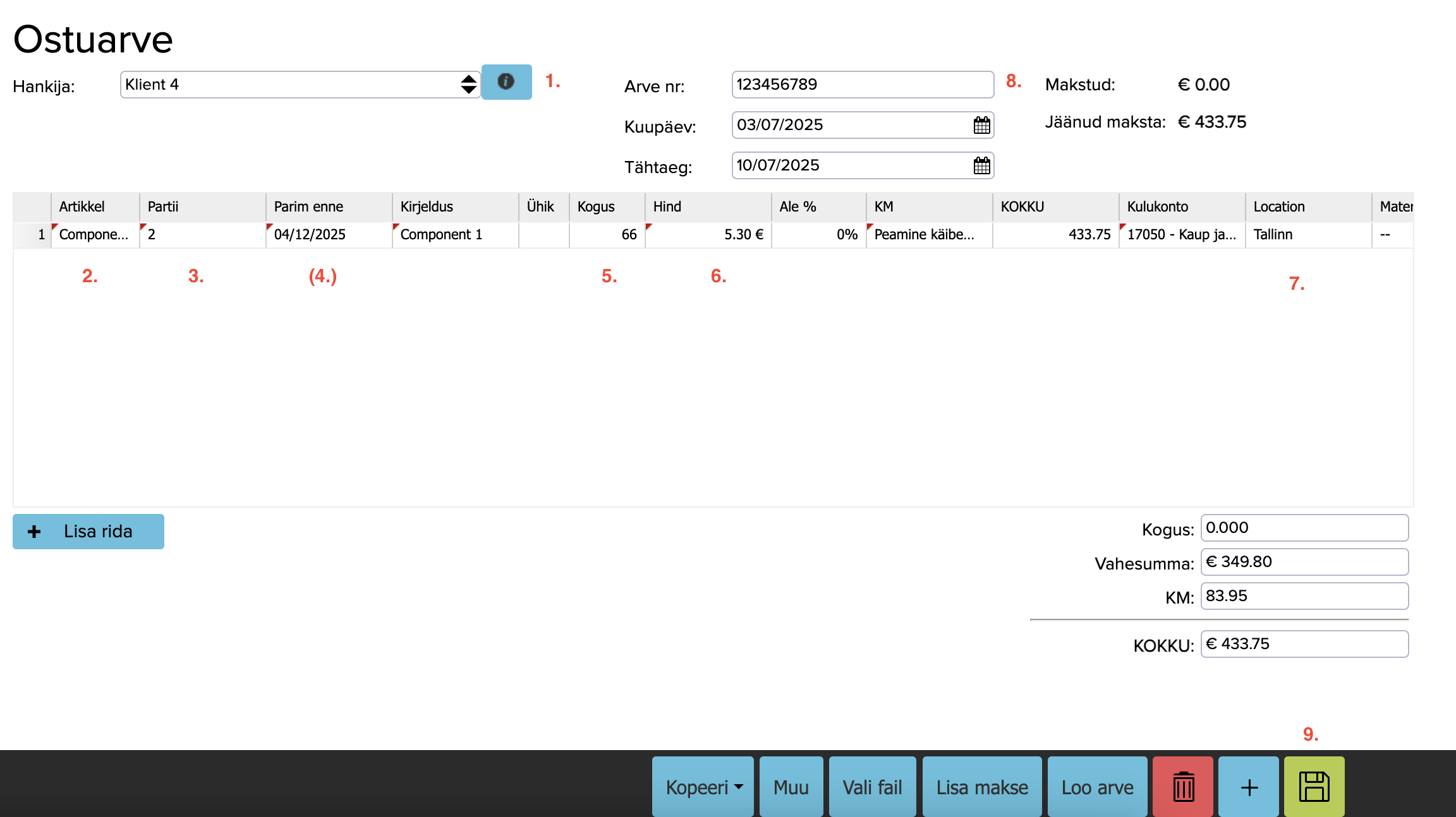 Kõigepealt tuleb lisada vajalikke andmeid, nagu hankija, artikkel, partii, kogus, hind, osakond (projekt, kus ost toimus), arve number. Samuti saab muuta välju vastavalt enda ettevõtte vajadusele. Kui kõik andmed on lisatud, siis vajutage rohelisele nupule “Salvesta”.