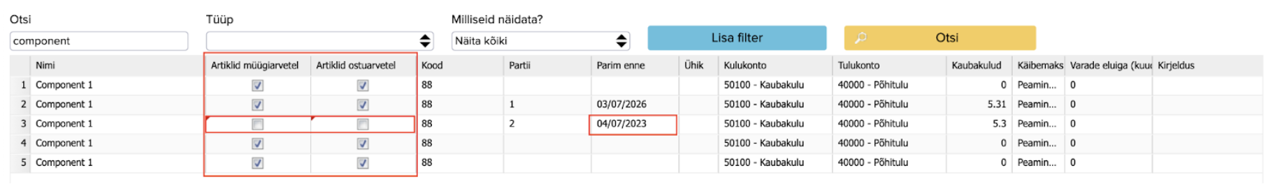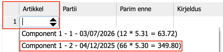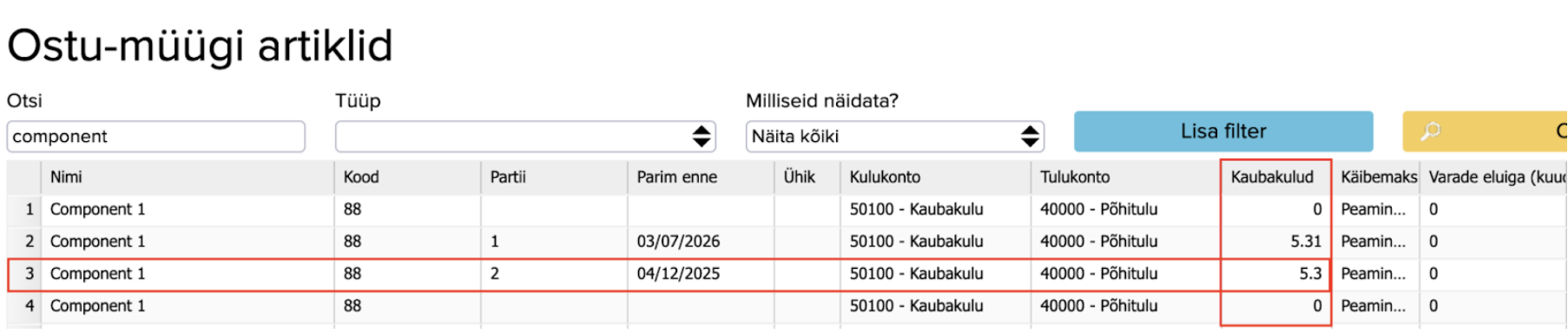 Siin on Component 1 viis korda. See on toode koodiga 88. 88 on identifikaator tootele Component 1. Kui ostate toodet 88 erineva hinnaga, kontrollib süsteem nende artiklite seast, kas õige artikkel on juba olemas või tuleb uus luua. Kui müüte toodet, valite õige partii.