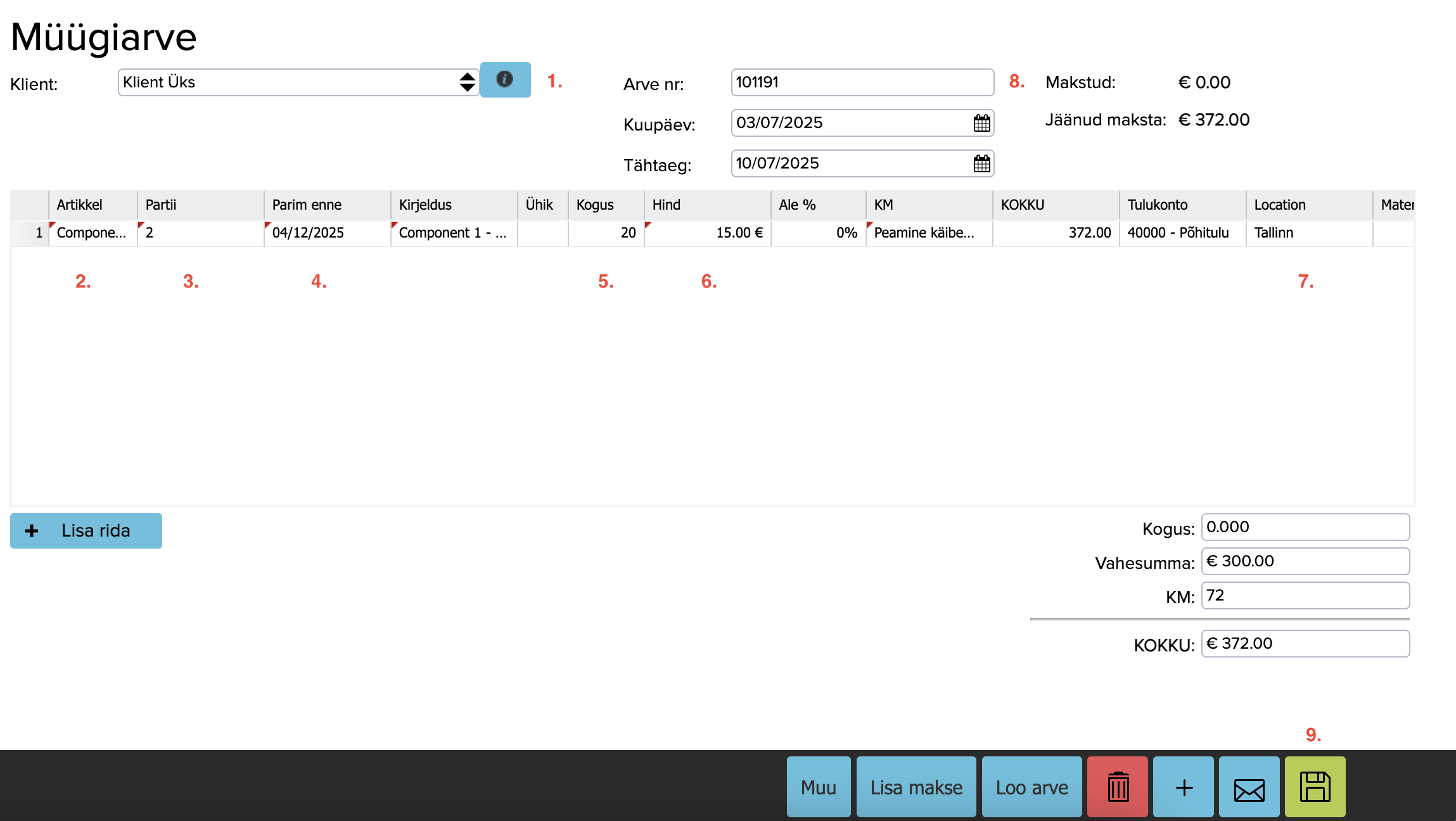 Samamoodi nagu ostu puhul tuleb lisada klient, artikkel, partii, kogus, hind, osakond (projekt, kus ost toimus), arve number. Samuti saab muuta välju vastavalt enda ettevõtte vajadusele. Kui kõik andmed on lisatud, siis vajutage rohelisele nupule “Salvesta”.