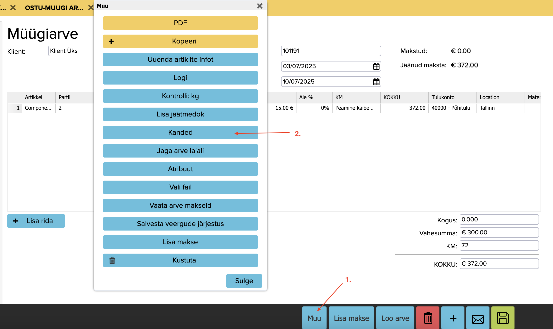 Lisaks saab vaadata kandeid, mis on seotud selle arvega. Selleks tuleb vajutada “Muu” -> “Kanded” ning avada vajav.