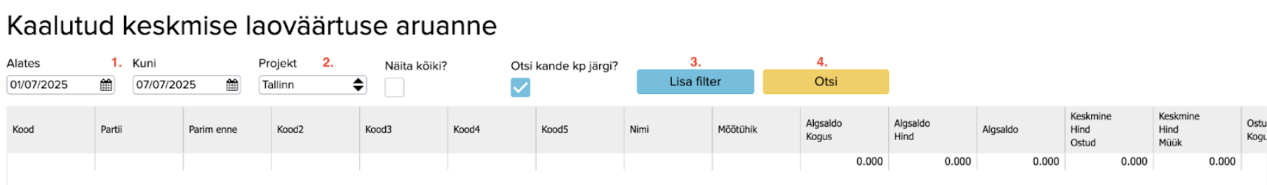 Aruannet on võimalik vaadata, liikudes menüüsse “Ladu” > “Kaalutud keskmise laoväärtuse aruanne”.