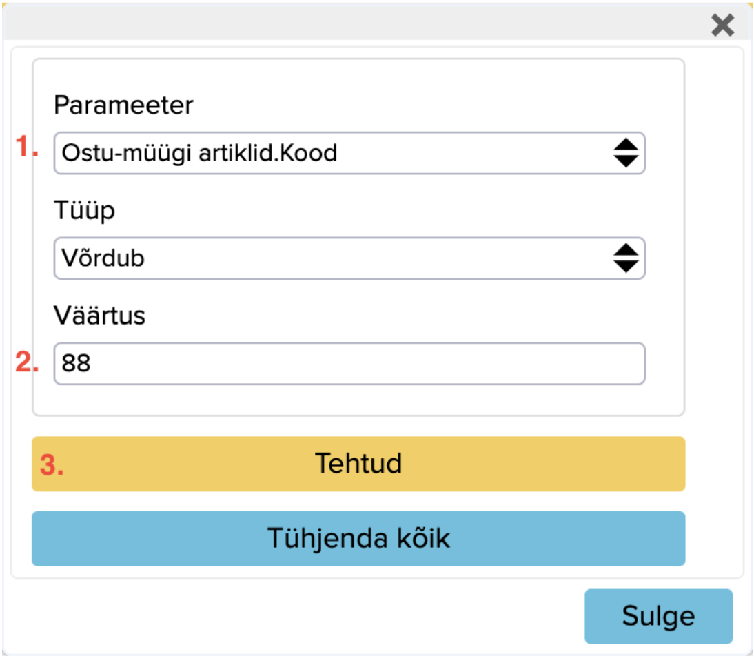 Näiteks kui “Lisa filter” kaudu valida artiklikoodiks 88, kuvatakse kõik kaubad, millel on laojääk ja see kood. Kui lisaks panna linnuke “Näita kõik?”, siis süsteem annab ka ilma laojäägita kaubad. On võimalik otsida ka teiste parameetrite järgi.