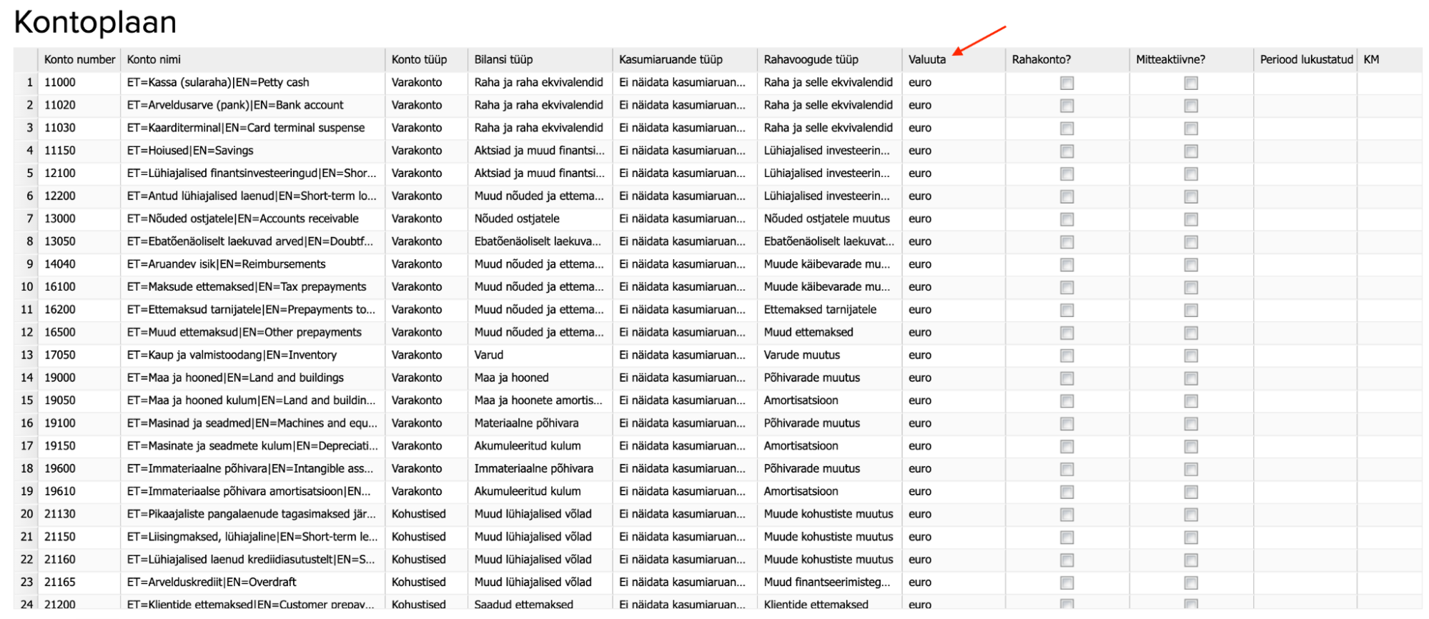 Avades kontoplaani (RMP -> Kontoplaan) näeme, et seal on näha iga konto kohta, millises valuutas selle konto arveldus toimub. Kui mingil kontol on teine valuuta kui põhivaluuta, siis läheb see välisvaluuta aruandesse.