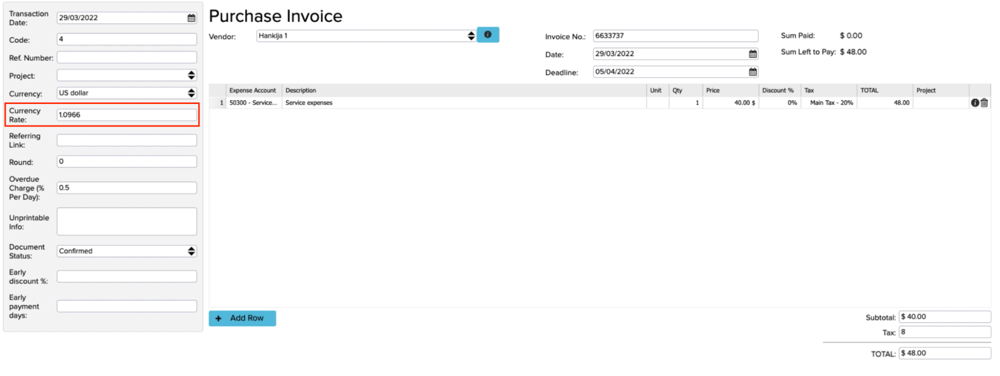 Kuna valuutakursid on pidevas muutuses, siis siin kuvatakse saldo selle kursiga, mis oli tehingu tegemise hetkel. Seda kurssi näeb ka selle sama osturve pealt (näidatud alumisel pildil punase kastikesega). Kuna aga ostuarve koostamine ei tähenda koheselt ka selle makse laekumist, siis võib hiljem makse laekumise ajal olla Võlad tarnijatele kontol teine euro kurss. Sel juhul tuleb teha kursi muutuse kanne.