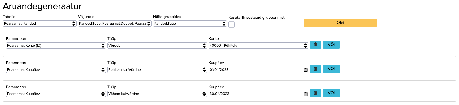 Kui soovid näha tehinguid, mis jäävad lao kande tõttu ühte kuusse ning müügikäibe aruande järgi teise, siis selleks saad koostada aruandegeneraatoris järgmise aruande (väljundisse Kanded.Tüüp, Pearaamat.Deebet, Pearaamat.Kreedit):