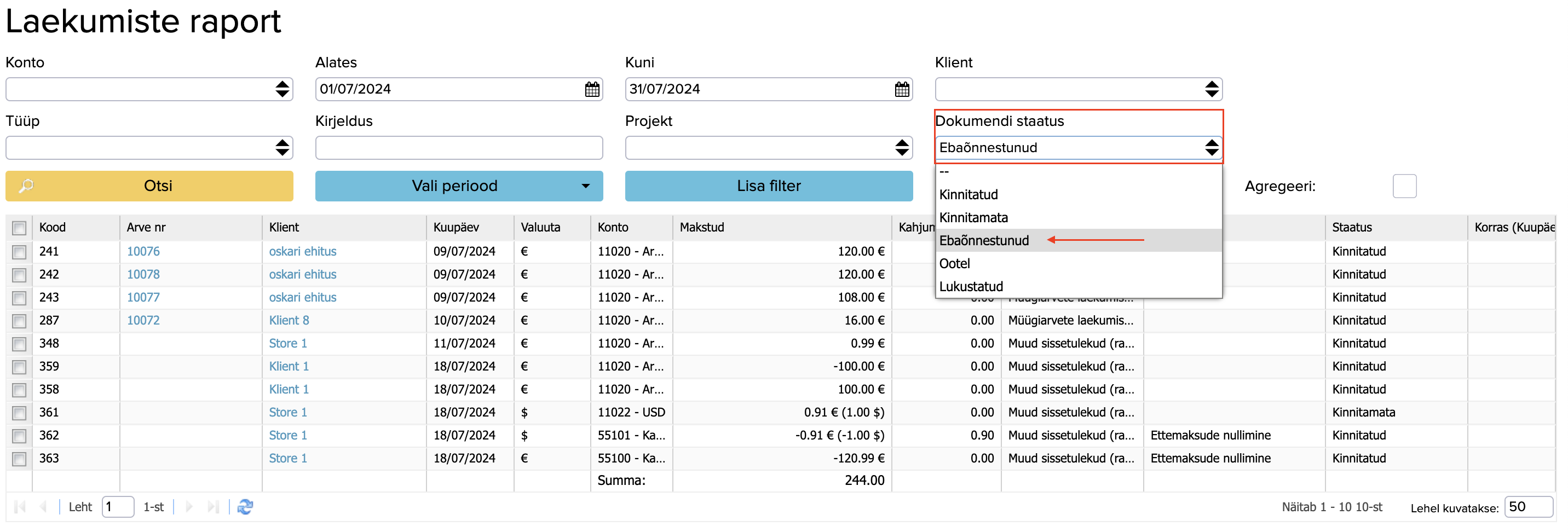 Kui soovite vaadata ainult raha sissemakseid, minge “Müük” -> “Laekumiste raport”. Valige Dokumendi staatuseks “Ebaõnnestunud” ja vajutage “Otsi”. Vajaduse korral täitke muud väljad.