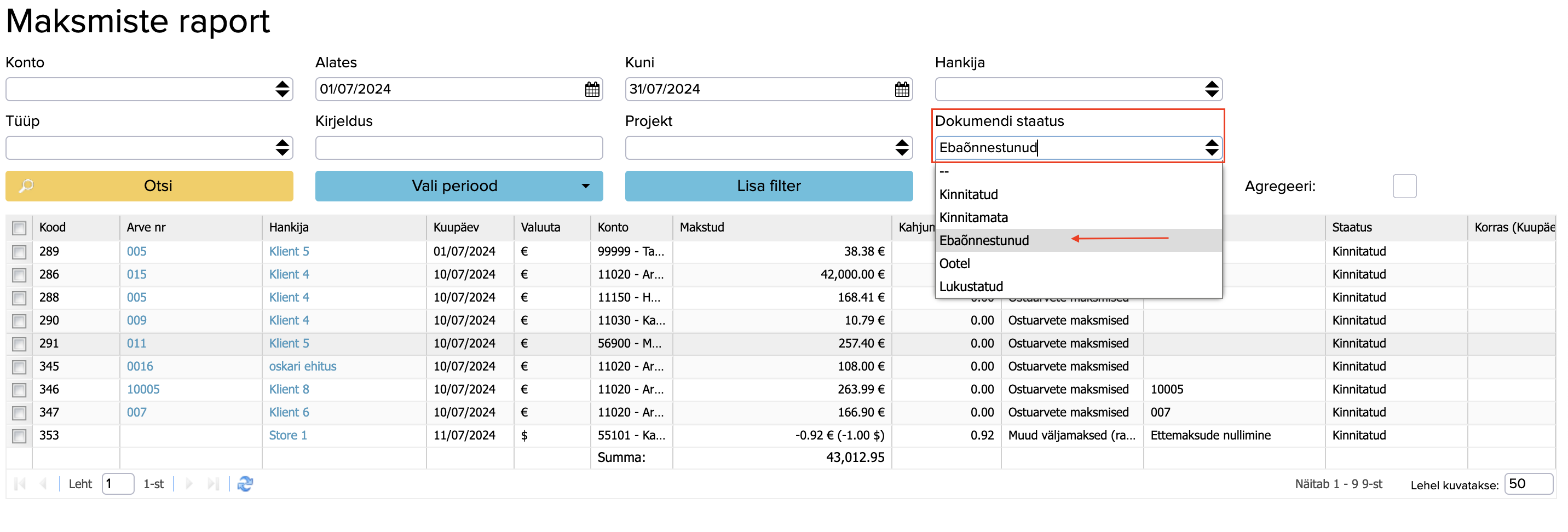 Kui soovite vaadata ainult raha väljamakseid, minge “Ost” -> “Maksmiste raport”. Valige dokumendistaatuseks “Ebaõnnestunud” ja vajutage “Otsi”. Vajaduse korral täitke muud väljad.