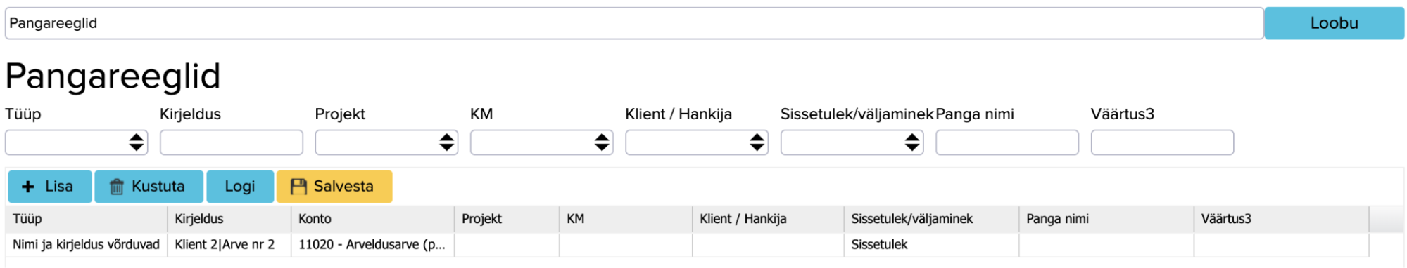 Kui salvestasid makse ära, siis pangareeglite moodulisse (pealehelt otsi “Pangareeglid”) lisandub uus rida ehk reegel.