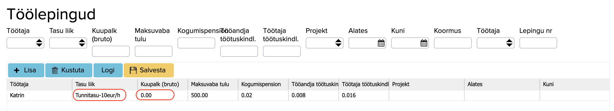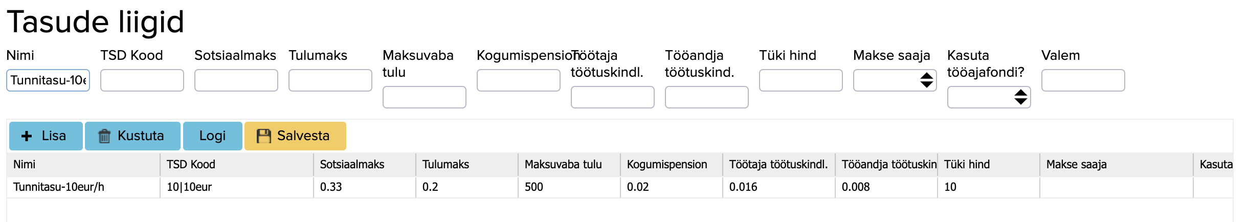 Uue töötasu liigi lisamise jaoks ava ”Palk -> Palgaarvestuse reeglid -> Tasude liigid”. Uue liigi lisamiseks vajuta sinist ”Lisa” nuppu. Seejärel täida lahtri vajaliku infoga ja salvesta. Järgnevalt on toodud näide tunnipalk 10€/h kohta: