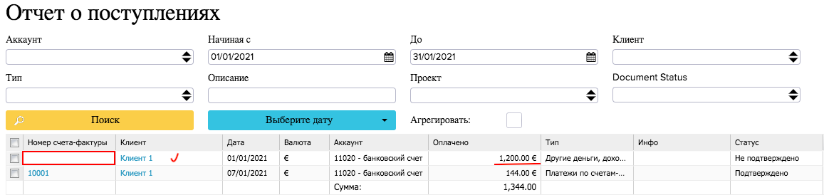 Поступление предоплаты отличается от поступлений счетов тем, что колонка «Номер счета» будет пустой. При оплате счета там появится номер счета, который был оплачен.