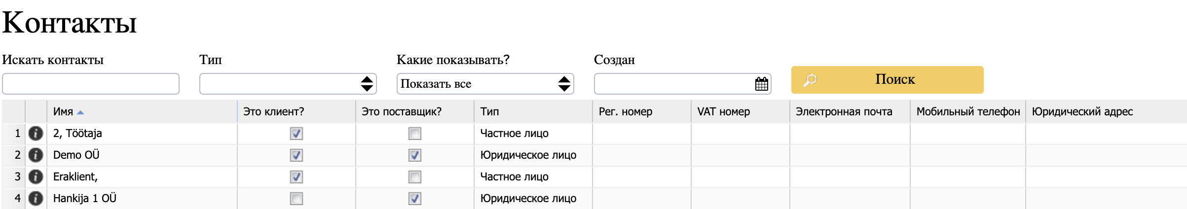 Контакты в программе ERPLY Books делятся на три группы: клиенты, поставщики и работники. Всеми сторонами, упомянутыми выше, можно управлять в модуле контактов. «Продажи» или же в разделе «Покупка» → «Контакты».