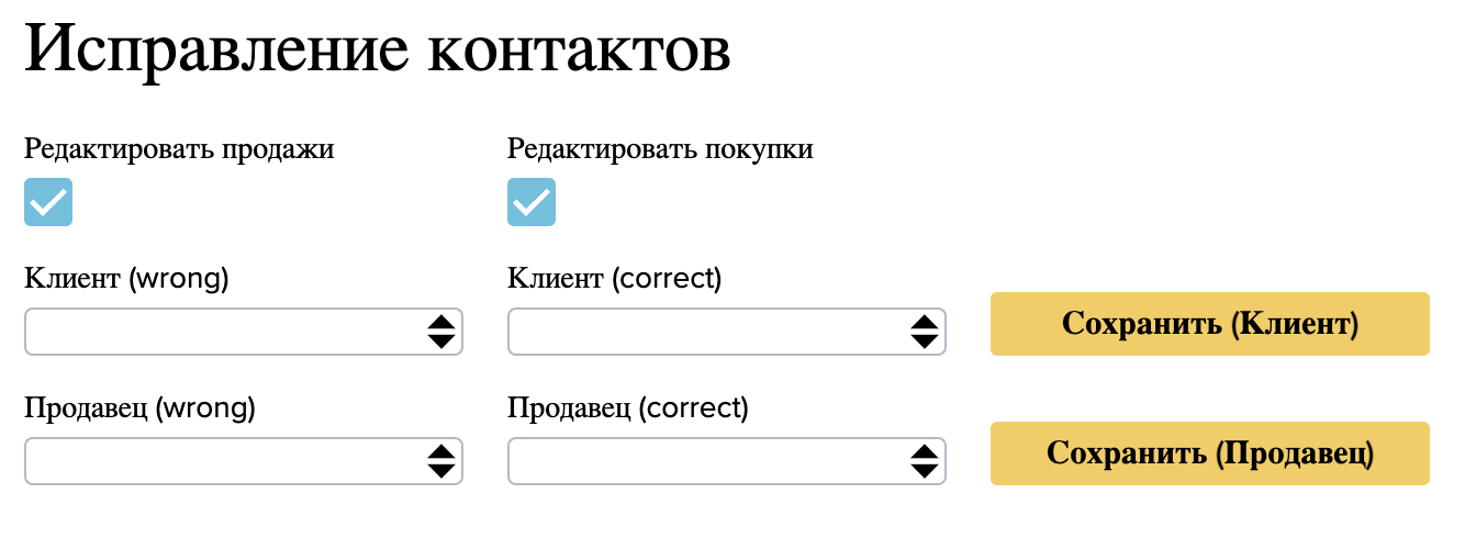 Затем перейдите в Приборную панель и в поле поиска напишите «Kontaktide korrigeerimine». В следующем окне «Исправление контактов» замените неправильный контакт «Клиент (wrong)» правильным «Клиент (correct)». При выборе галочкой пунктов «Редактировать продажи» и «Редактировать покупки» неверный контакт в уже введенных данных будет заменен на новый. В конце нажмите «Сохранить (Клиент)» или «Сохранить (Продавец)».
